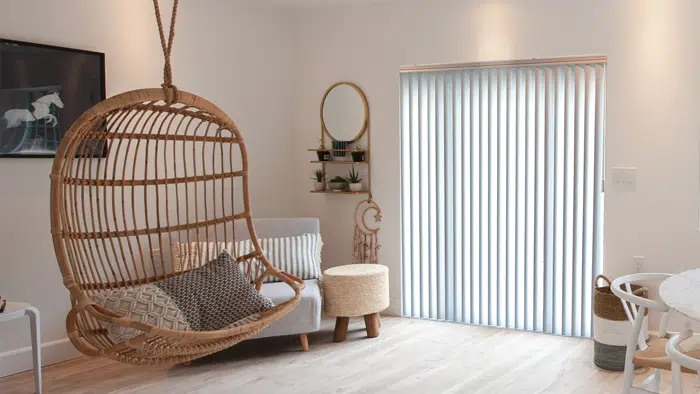 Vertical blinds come with vanes hanging off the headrail in a vertical orientation. The cordless design makes the vertical blinds great for covering extra wide windows and sliding doors, while also being child and pet safe.