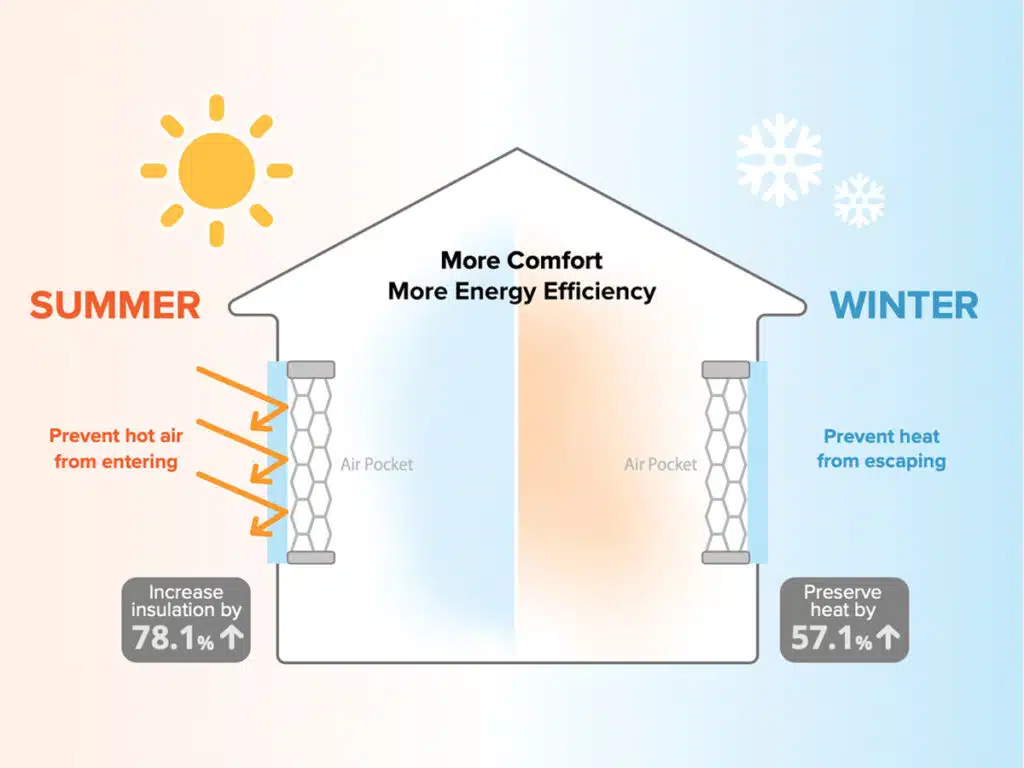 In case you aren’t familiar, insulated window shades are designed to block the sun’s heat and reduce the need for energy consumption. This is achieved by trapping pockets of air in between two layers of fabric to create an insulating barrier that stops unwanted heat gain from entering or preventing desired heat from leaving a room.
