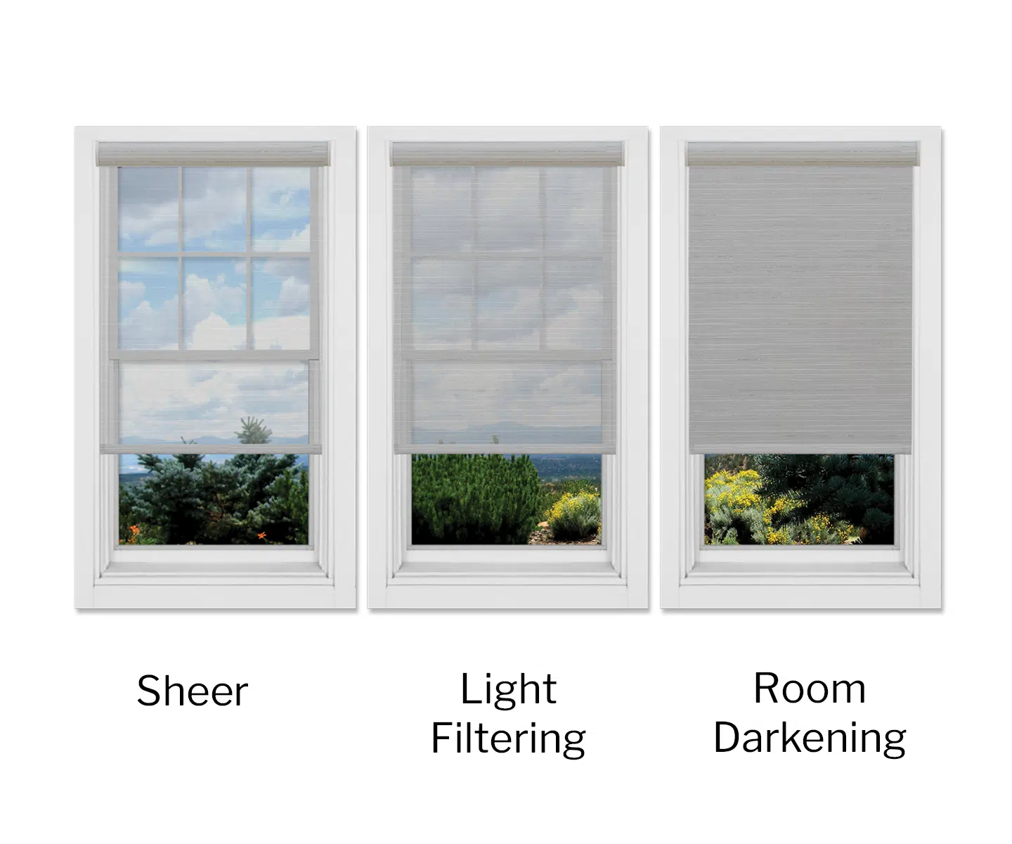 Select an opacity depending on your view-through preferences and practical requirements. Sheer shades will provide an atmospheric touch with significant view-through while softening the outside view. Light filtering shades offer a wide range of light diffusion from bright to dim, ensures privacy, and may reveal shapes or outlines depending on the fabric selected. For environments where blackout and privacy control are a must, room darkening shades are the perfect choice due to their ability to block almost 100% of incoming light.