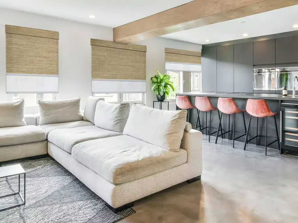 - Dual roller shades: Offering the versatility of two fabric shades in one, dual roller shades let you switch between sheer or blackout panels depending on the time of day.