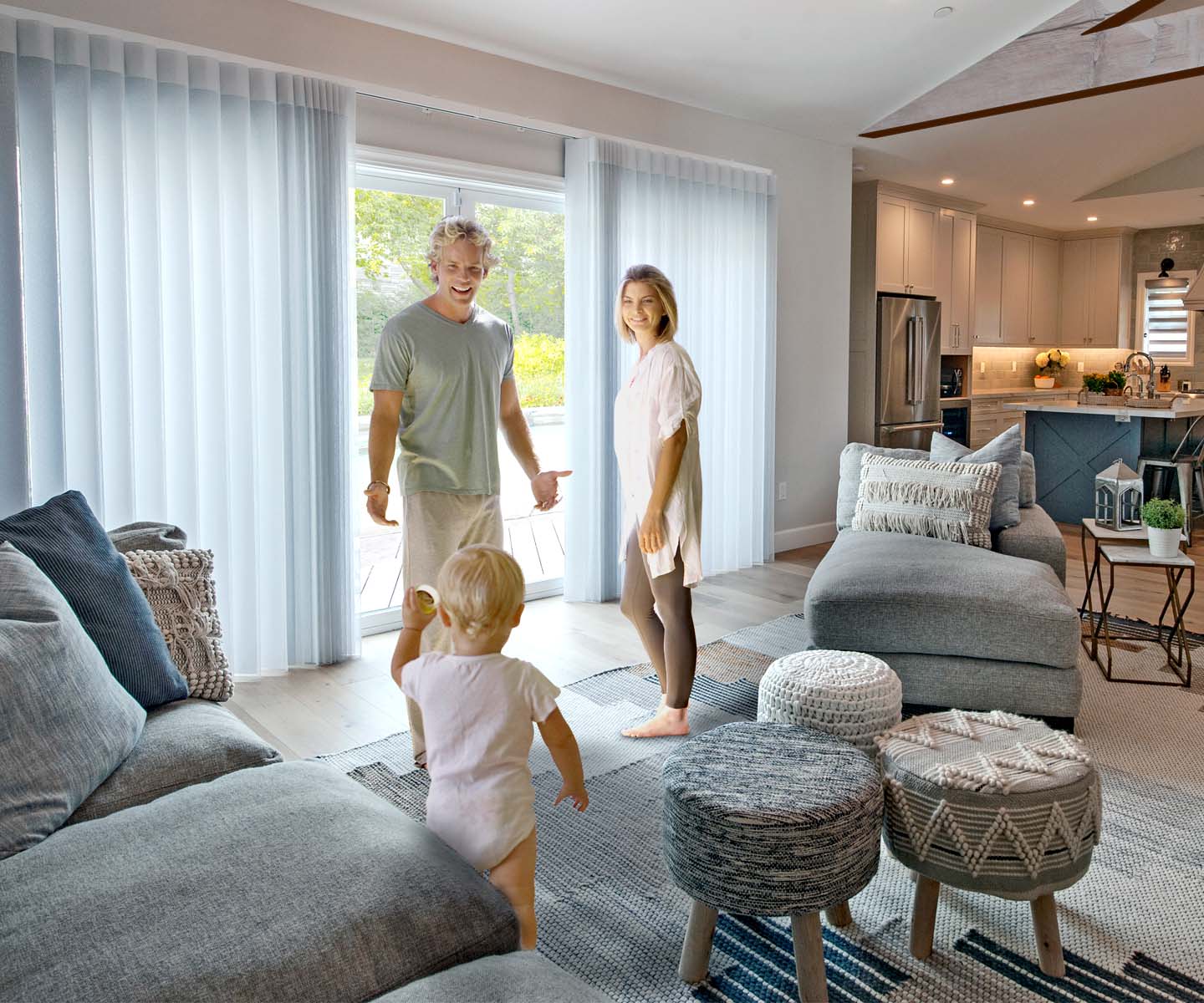 Soft like drapery and delicately architectural, SmartDrape™ is constructed from a series of individual fabric vanes, offered in your choice of light filtering and room darkening fabrics. Suspended in sheer that comes in a wide assortment of patterns and textures to create an elegant floating effect, these shades are specially made to bring you style. Perfect for large sliding doors, the individual fabric vanes allow you to walk through the shade even while it is closed. Along with “Best for Kids™” certified cordless operation, SmartDrape™ can infuse your space with a newfound level of enjoyment, privacy, light control, and peace of mind.
