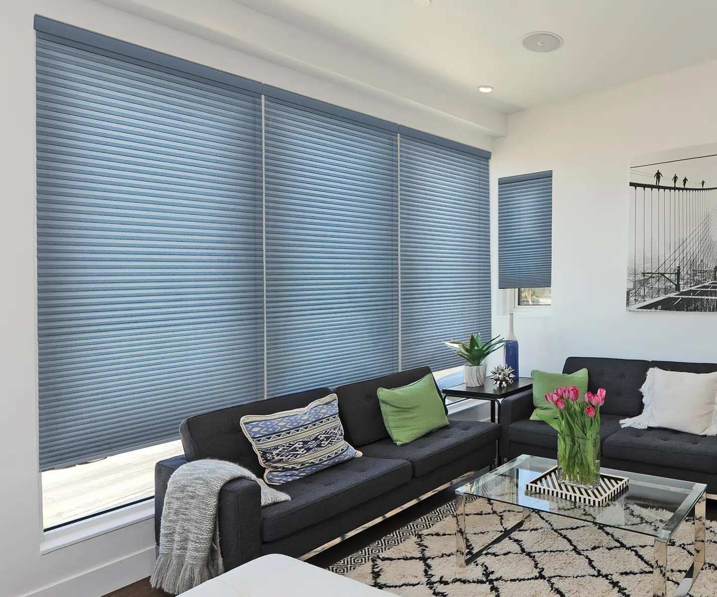 Roller shades, also known as solar screen shades, have been gaining popularity in recent years. Roller shades are aesthetically pleasing, as well as provide unmatched functionality when it comes to privacy and light control. Energy efficient honeycomb shades are making a comeback when it comes to family room window treatments, too. If you're looking to save a little extra money on your monthly energy bills, our Portrait™ honeycomb shades can help you keep your home cool in the summer and warm in the winter with its energy efficient design. Honeycomb shades also come in a wide variety of colors and textures and can complement your existing decor flawlessly.