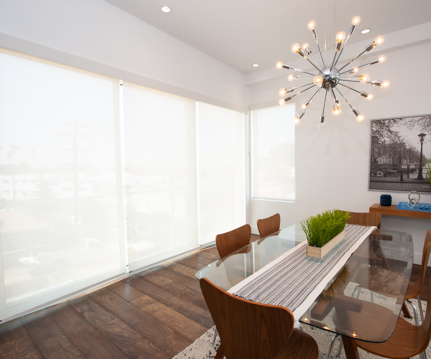 Dining room window treatments should be both functional and stylish. Centerpiece™ Roman shades are a popular choice because they offer a clean, classic look. If you want something with a little more personality, textured fabrics that offer the woven woods appearance in Soluna™ roller shades are a great option. For something more airy & ambient, consider SmartDrape™ in a light color.