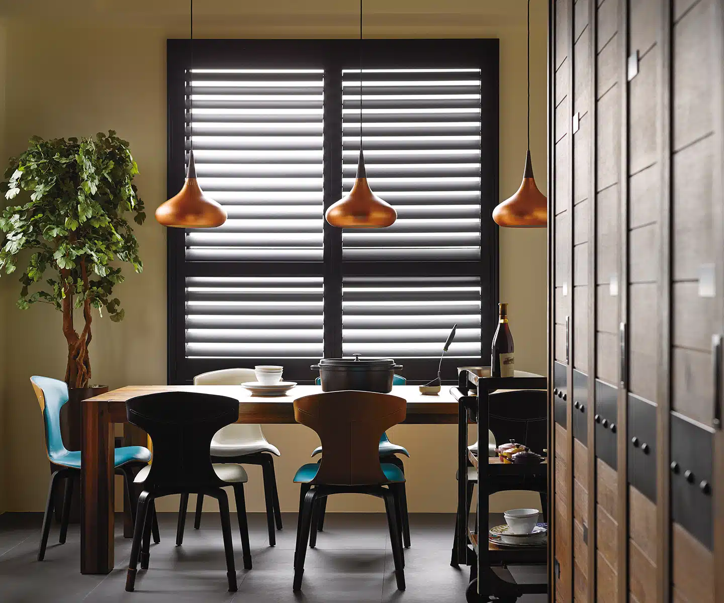 Their architectural design provides a classic look while maintaining the perfect balance of light control and privacy, making shutters a great option for dining rooms. Adjustable louvers make it easy to regulate natural light and airflow, creating a comfortable dining atmosphere.