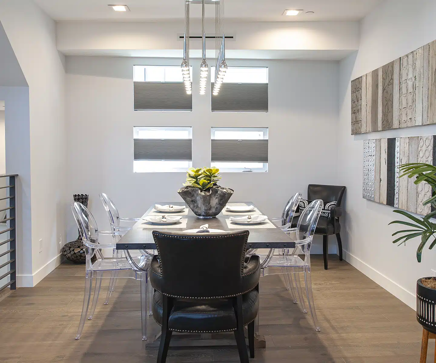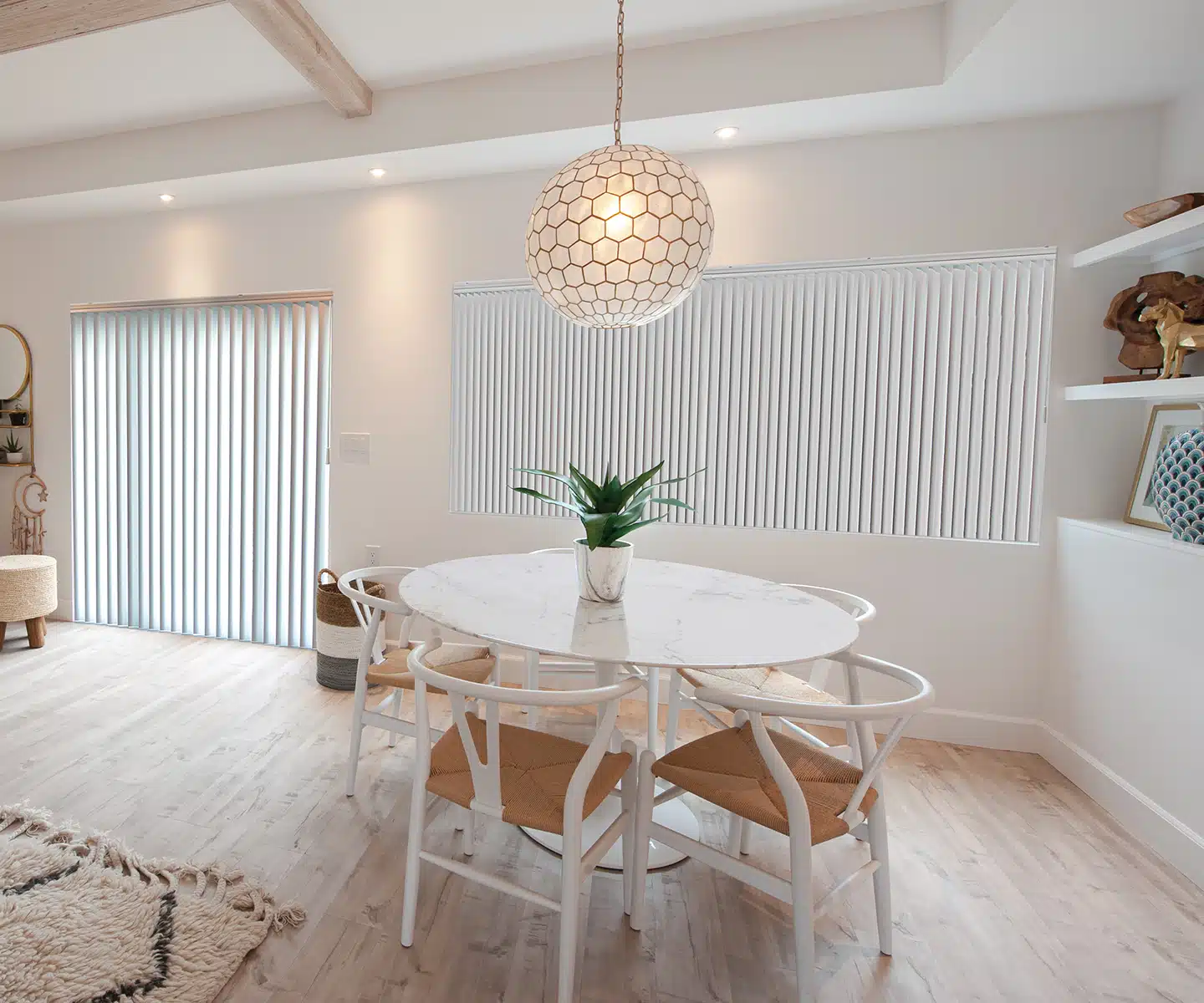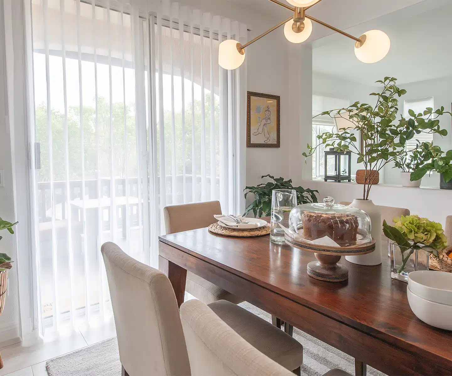 Blinds offer a blend of style and practicality. Depending on their design elements, they can enhance a formal dining room aesthetic or provide a minimalist and clean look. Their adjustability and versatility provide more privacy and light control than curtains or drapes. With easy-to-clean eco-friendly materials and affordable options, they’re a good choice for new homeowners.