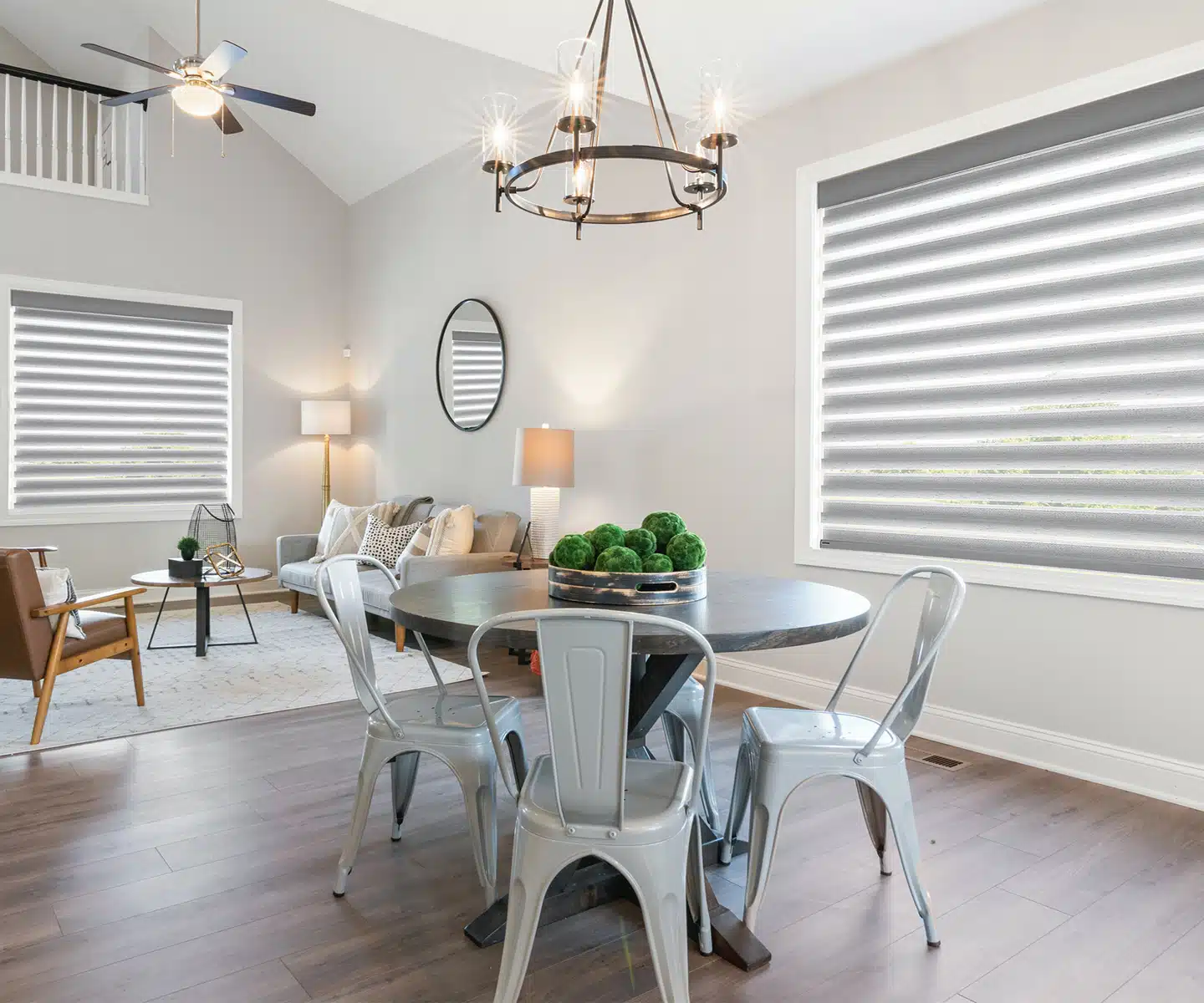 Plantation shutters are a great option for large rectangular windows. They provide insulation and privacy, while also allowing you to adjust the amount of light entering the room. They come in various color options & materials and can be customized to fit your space. Honeycomb shades are another great option for large windows as they are lightweight and easy to raise or adjust. Since they typically have a small fabric stack, the shade virtually disappears from the window, allowing great views to the outside without compromising interior design.