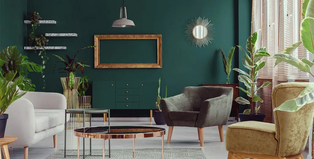 Explore the numerous green palettes from your favorite paint supplier including Benjamin Moore’s 2021 color of the Year, Aegean Teal or Forest Green. Crisp whites and chic golds will balance out the space.