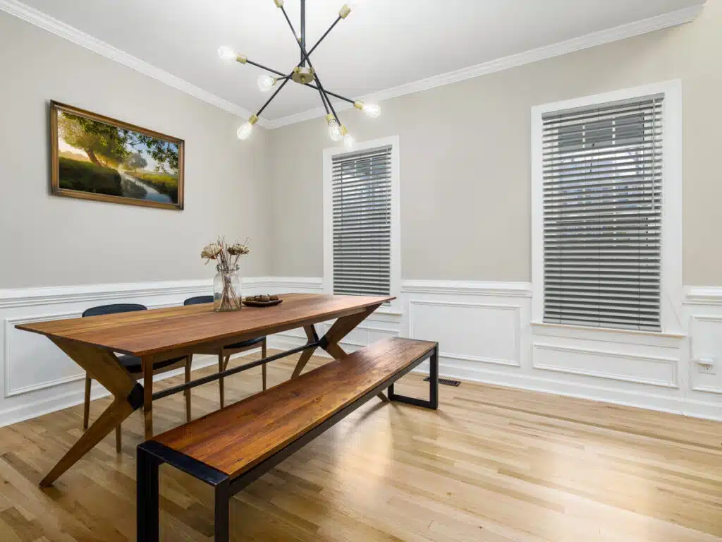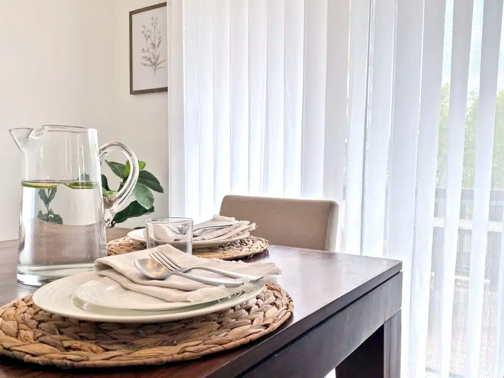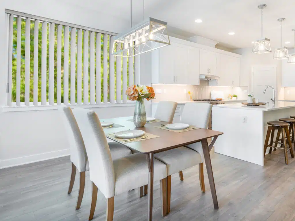 - Blinds: Offering a sleek and modern aesthetic, blinds provide precise light control and privacy with adjustable slats. Choose from horizontal or vertical orientations, as well as materials like wood, faux wood, or aluminum, to complement your dining room’s decor and functionality requirements.