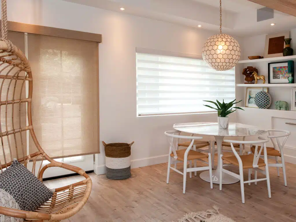 - Shades: From Roman to roller and cellular to solar, shades come in a plethora of styles, fabrics, and opacities, allowing you to customize your dining room’s ambiance to your liking. Whether you prefer a soft, diffused glow or complete blackout for intimate dinners, shades offer flexibility and style.