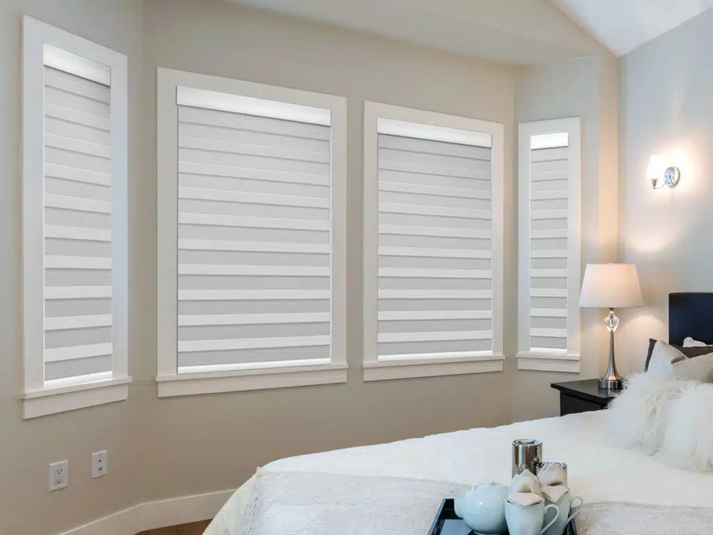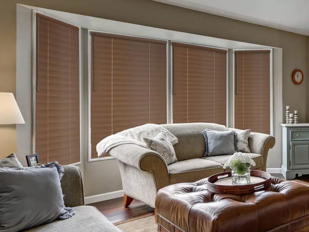 Installing Venetian blinds on each window panel allows for independent and adjustable light control to accommodate the unique structure. Featuring an innovative Smart Privacy design, Ultimate™ Faux Wood blinds provide a tighter closure for increased privacy that comes in handy for bay windows.