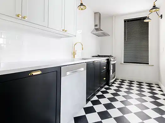 - Faux wood blinds: Norman® faux wood blinds are crafted from lightweight and safe, lead-free ABS materials. This durable option is highly moisture resistant, making it a great choice for above the sink.